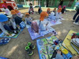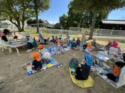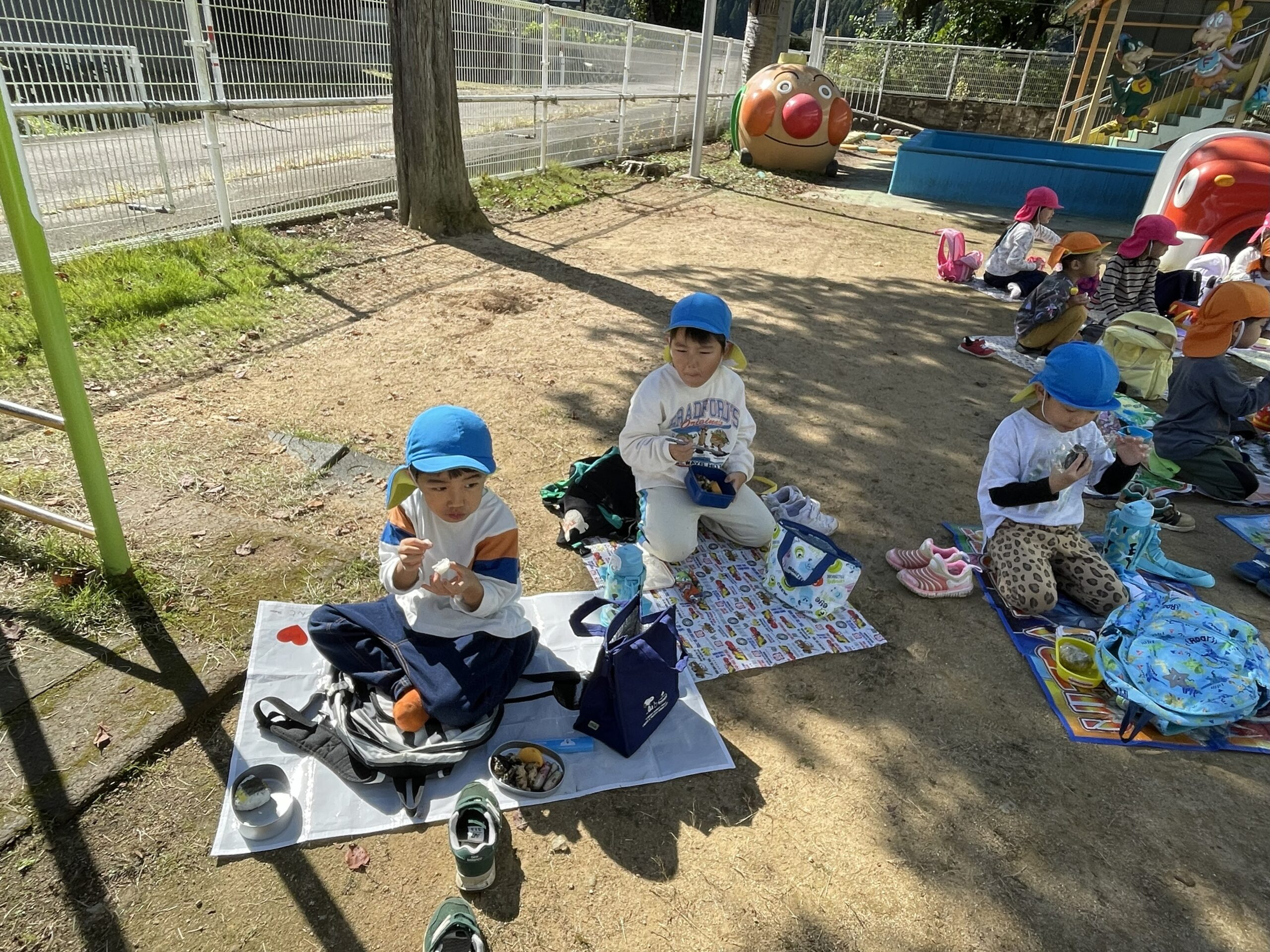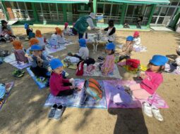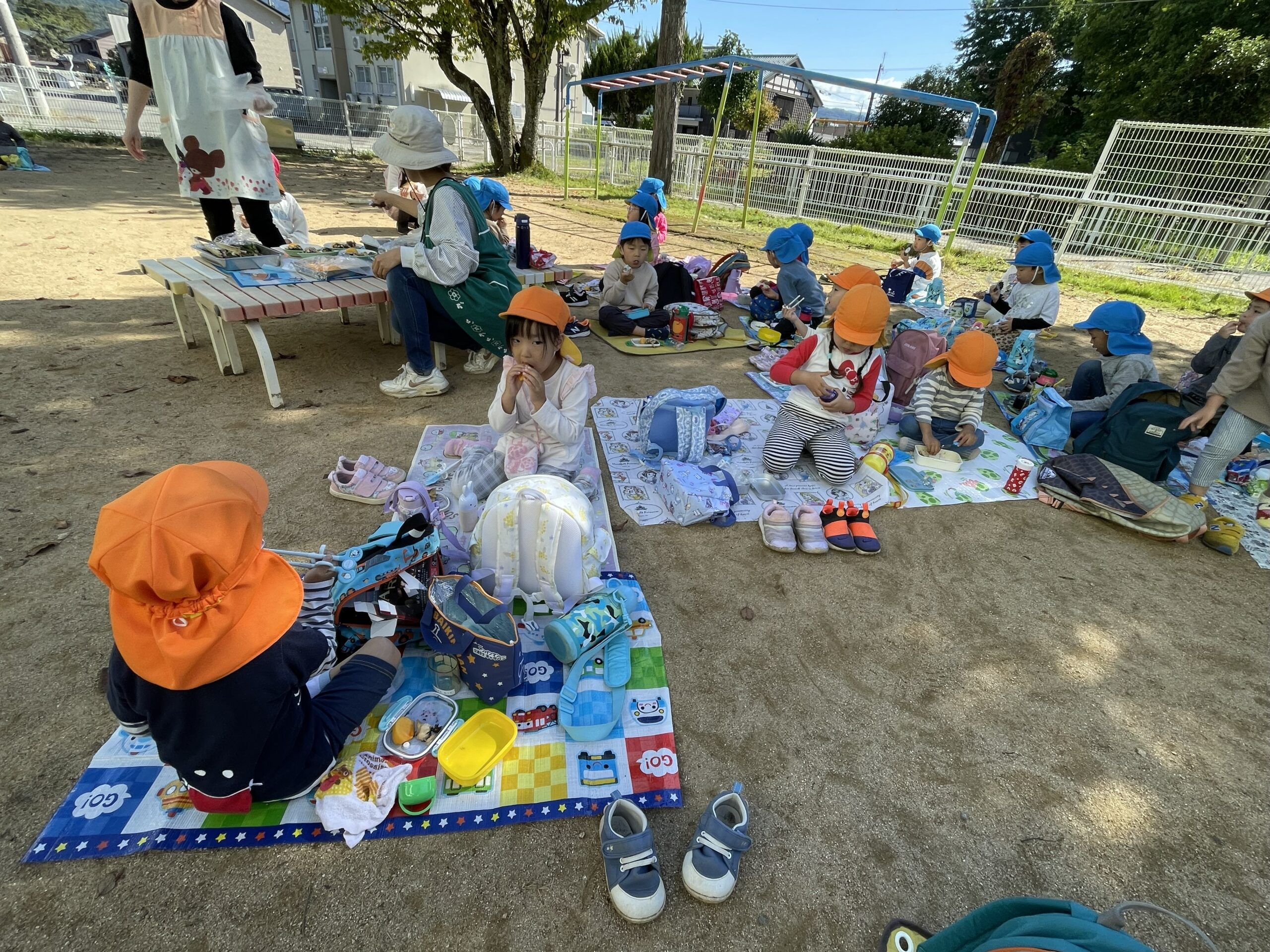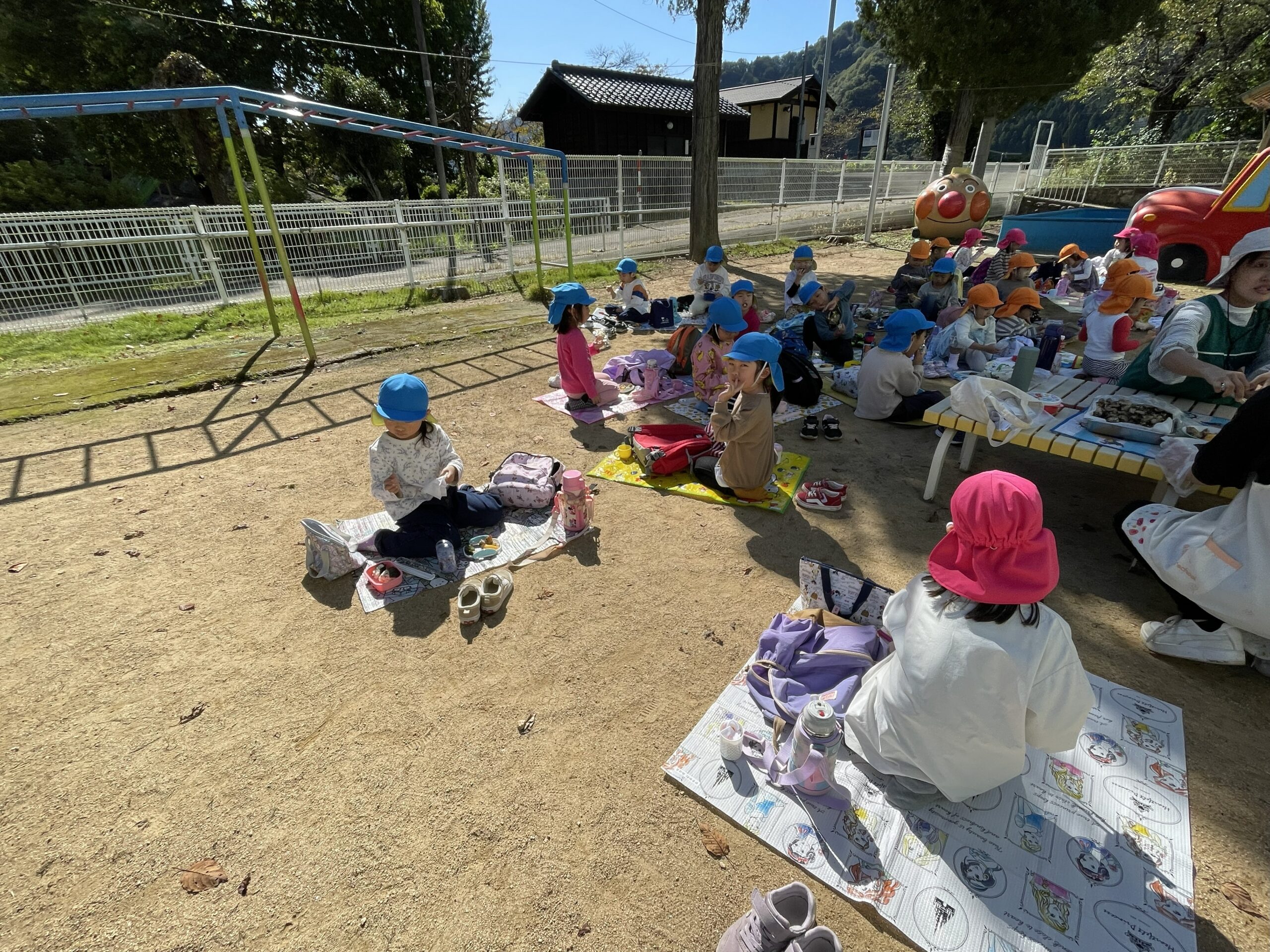 お天気がよかったので、シートを敷いて外で給食を食べました。