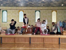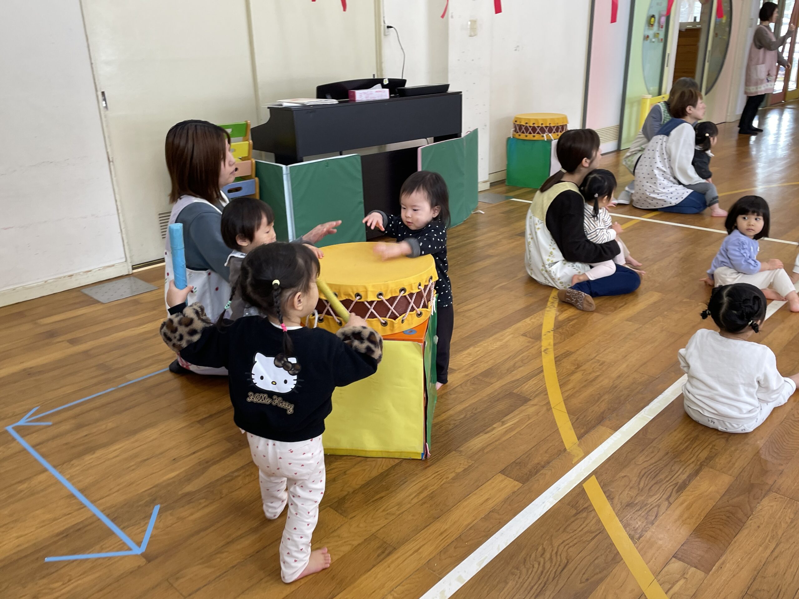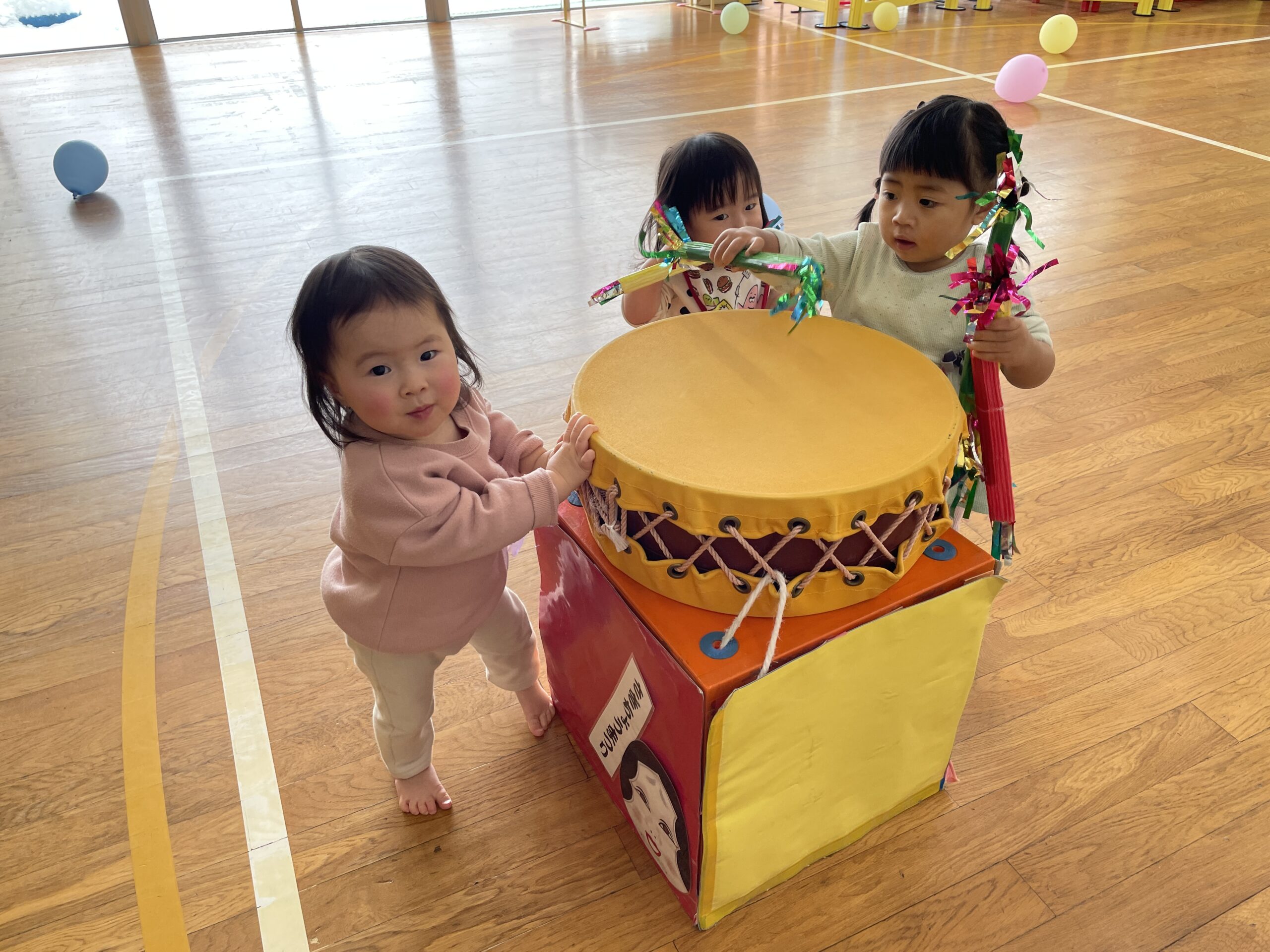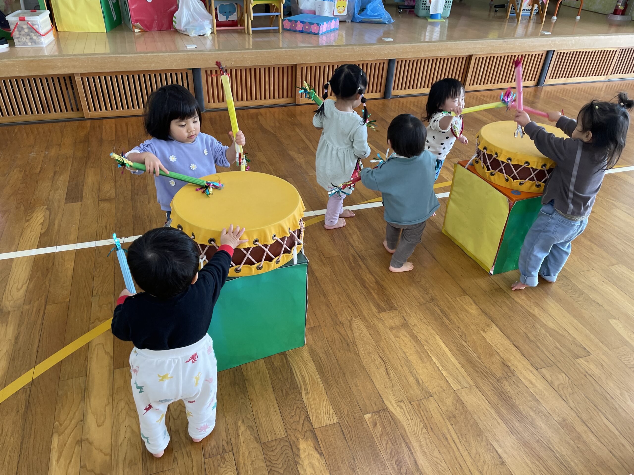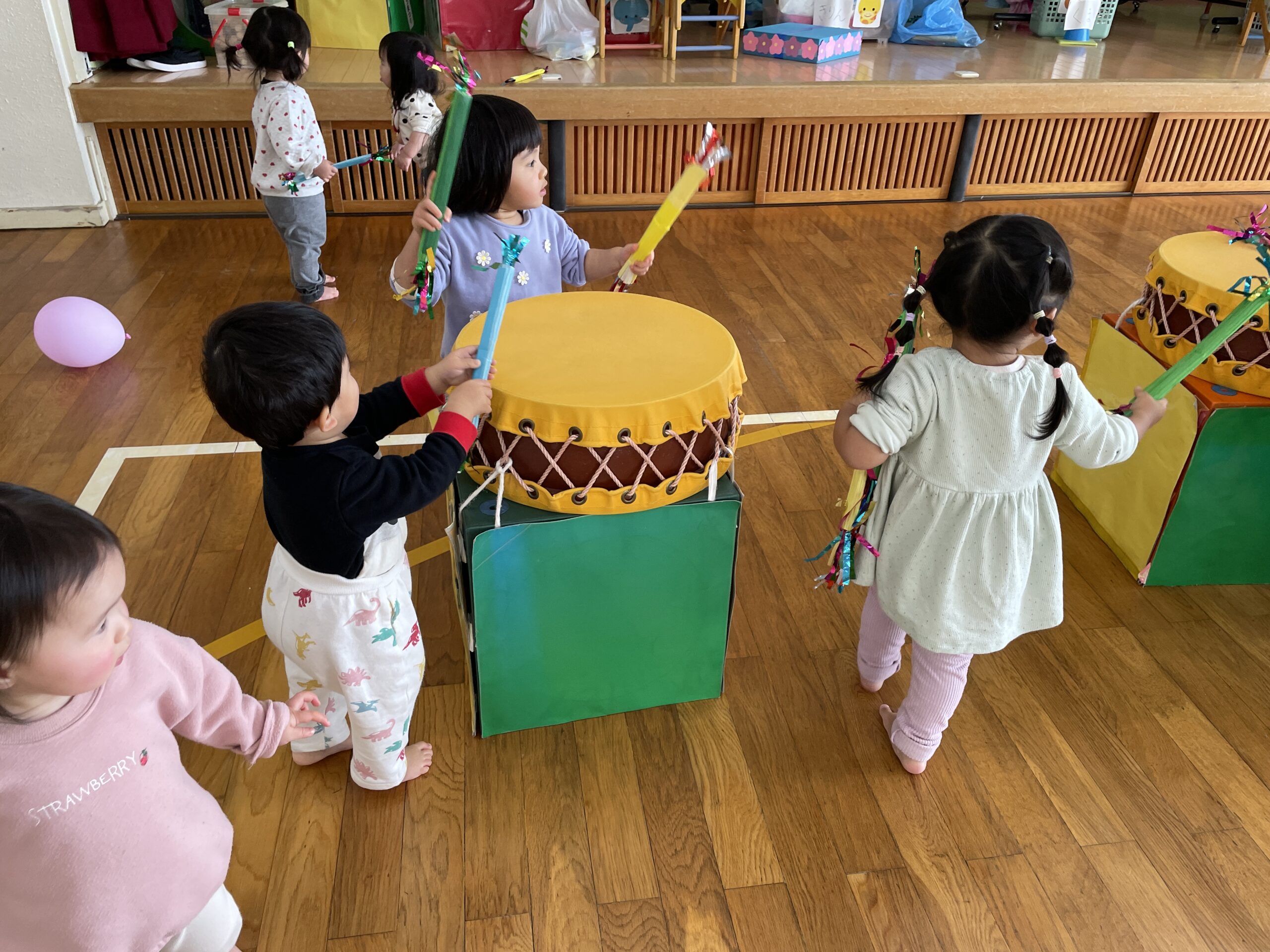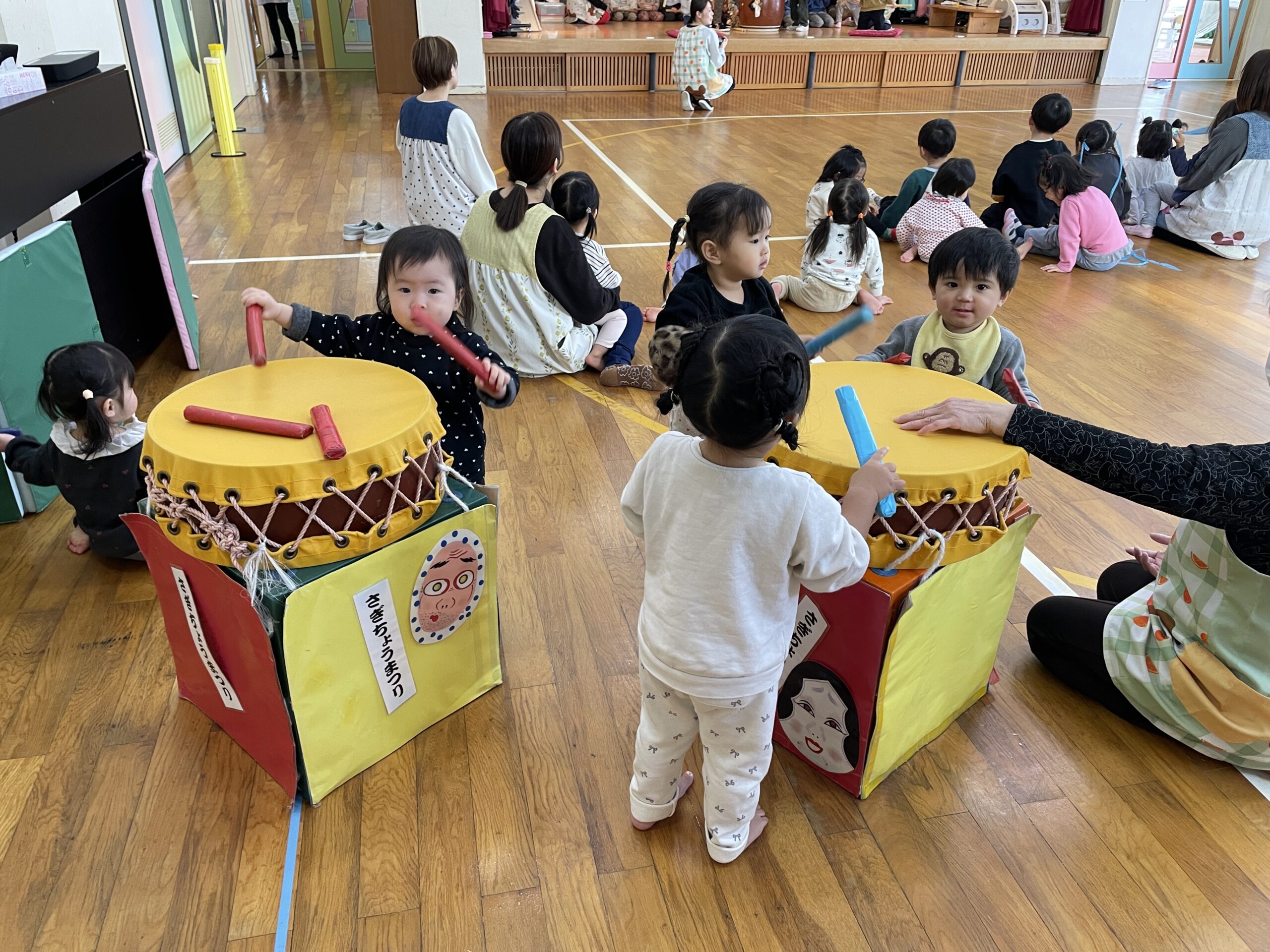 小さいお友だちも、楽しみながら浮かれたり、太鼓をたたいたり…左義長太鼓に親しみました。